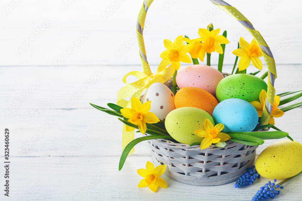 Colorful Easter eggs in basket and spring daffodil flowers on white wooden table.