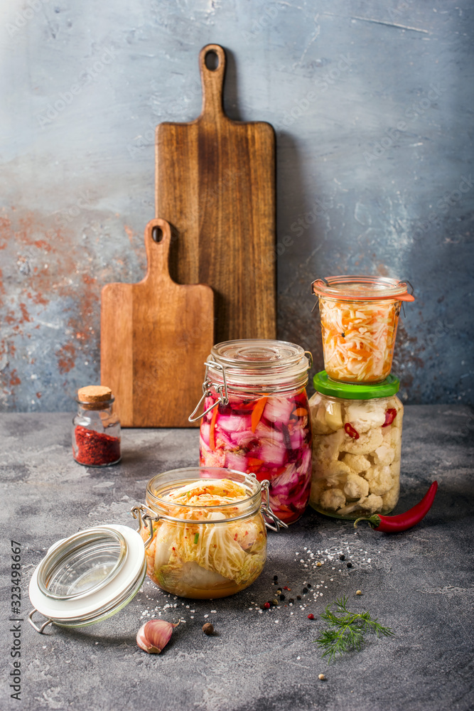 Fermented cabbage, fermented vegetables, kimchi, sauerkraut in glas jars, marinated canned food, natural probiotics, healthy eating, prebiotic rich food for digestion