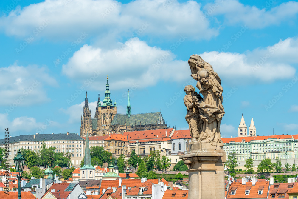 Top view to red roofs and blue sky skyline of Prague city Czech republic.