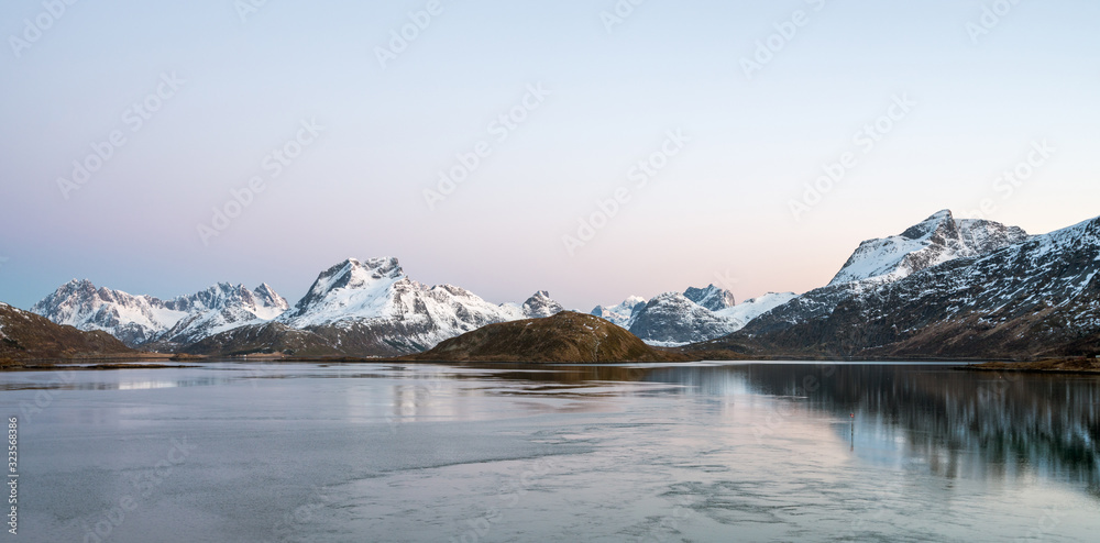 Panorama of Snow covered mountains and powerful streams in the ocean during blue hour in Flakstad, Lofoten in Norway. Pink and blue tones in the sky.