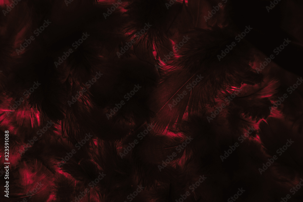 Beautiful abstract colorful black and red feathers on black background and soft pink feather texture on dark pattern and blue background, colorful feather, purple banners