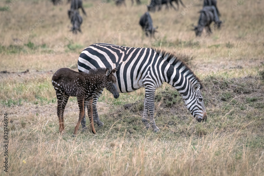 Rare zebra foal with polka dots (spots) instead of stripes, named Tira after the guide who first saw her, with its mother. Image taken in the Masai Mara National Park in Kenya.
