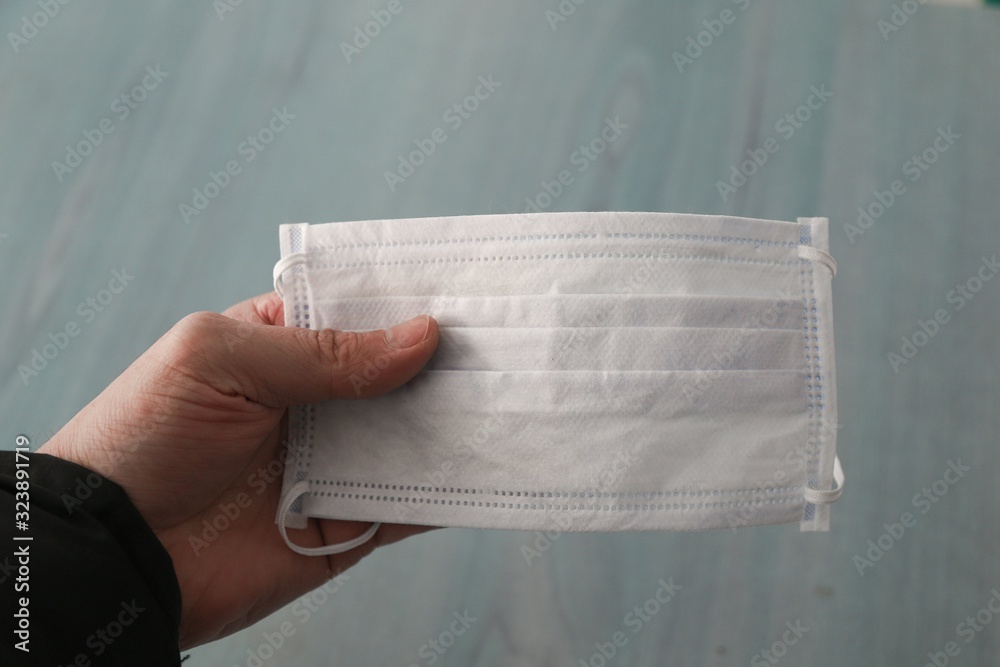 Hand holding black medical protective mask on white background