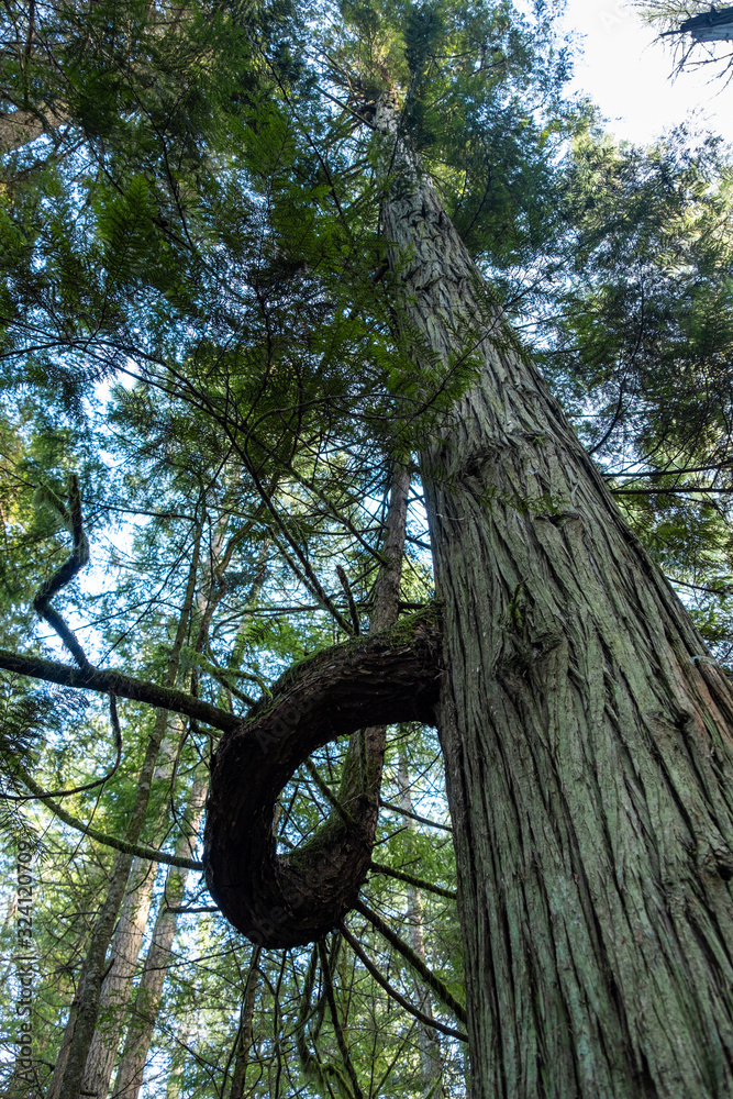 Giant tree with thick trunk and twisted branch inside forest with dense green foliage above under the sunlight