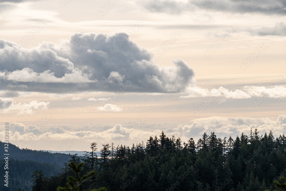 dense forest covered island under thick cloud near sunset on an over cast day