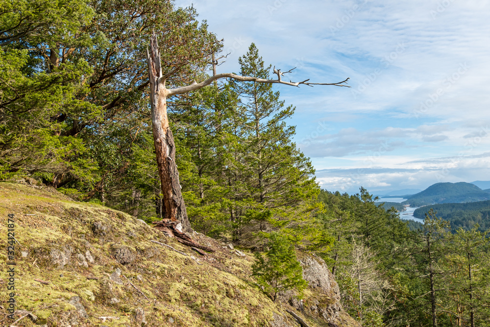 a dead arbutus tree trunk on the edge of the cliff surrounded by pine trees and moss covered ground with forest covered land down below the cliff on a cloudy day