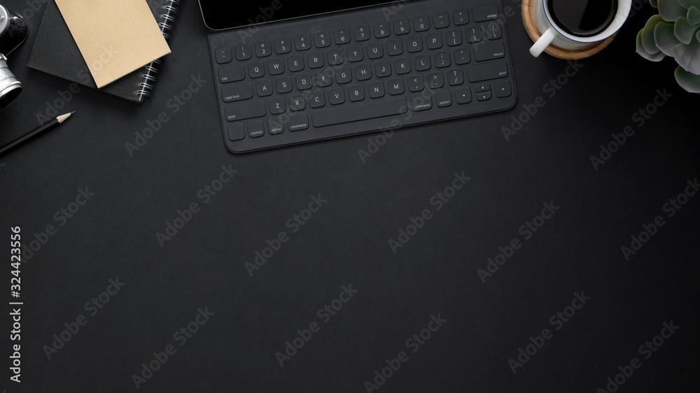 Top view of workplace with wireless keyboard, copy space, office supplies and coffee cup on black table