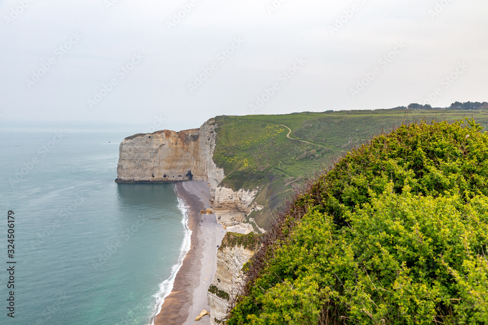 Rocks on the coast of the English channel strait. Etretat village, Normandy region, France.