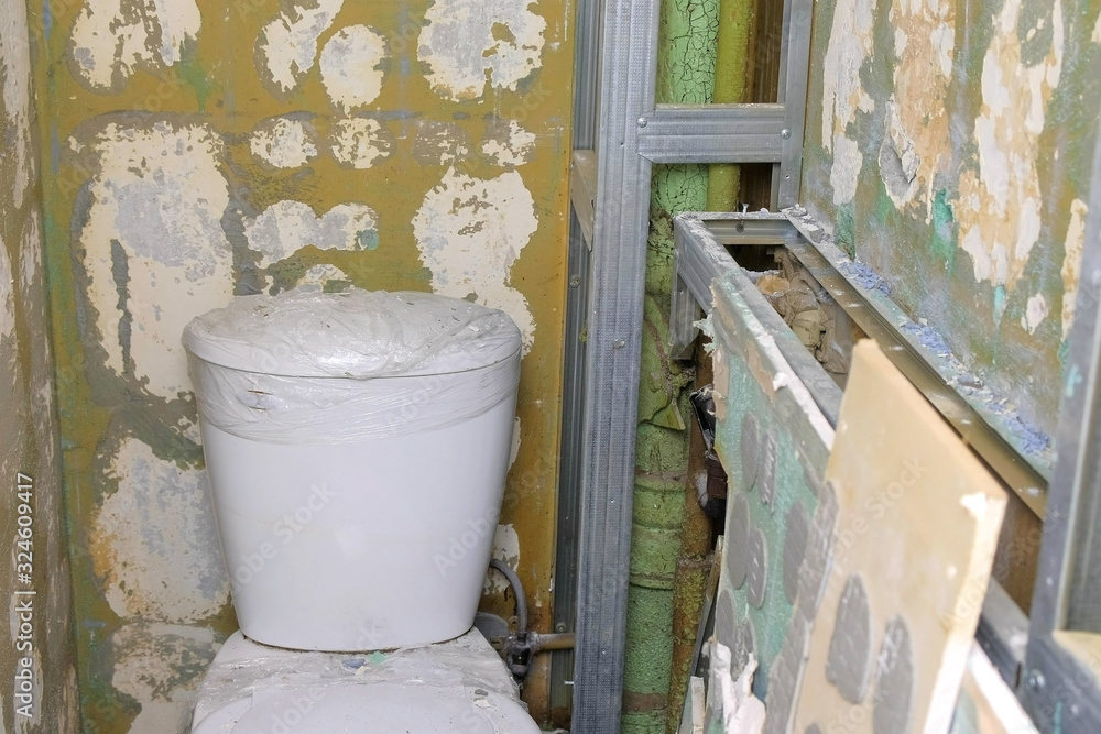 Ruined toilet lavatory room during renovation with cleaned walls from tile and gypsum cardboard. Construction garbage on the floor and near the walls.