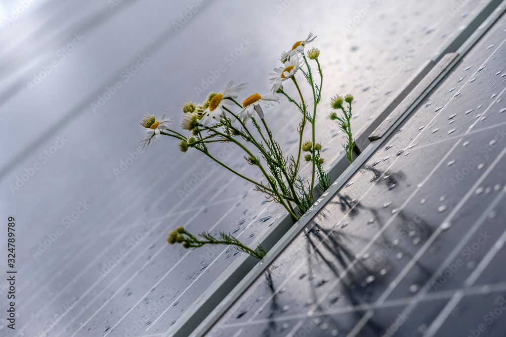 Camomille flowers growing through solar panel. Ecological friendly electricity generation. Solar panel.