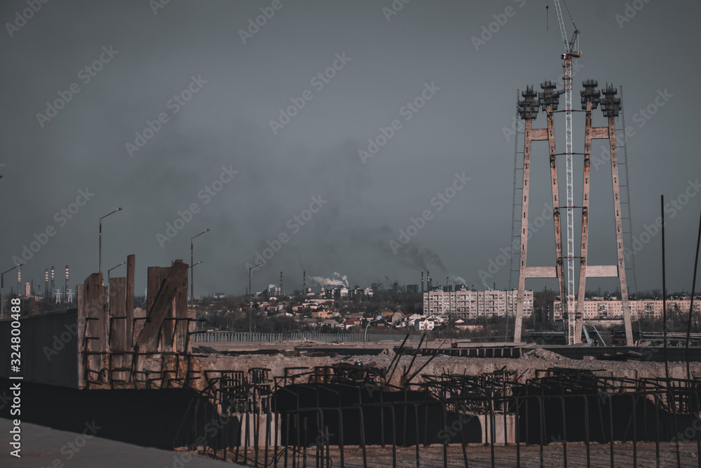 Industrial landscape of the city with smoke emissions from chimneys. Industry zone with building constructions.