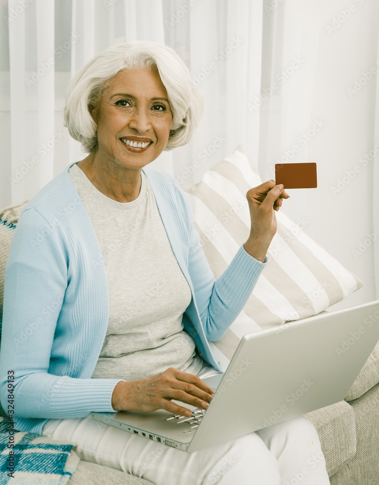 Cheerful Mature Lady Laughs Using A Credit Card And Computer