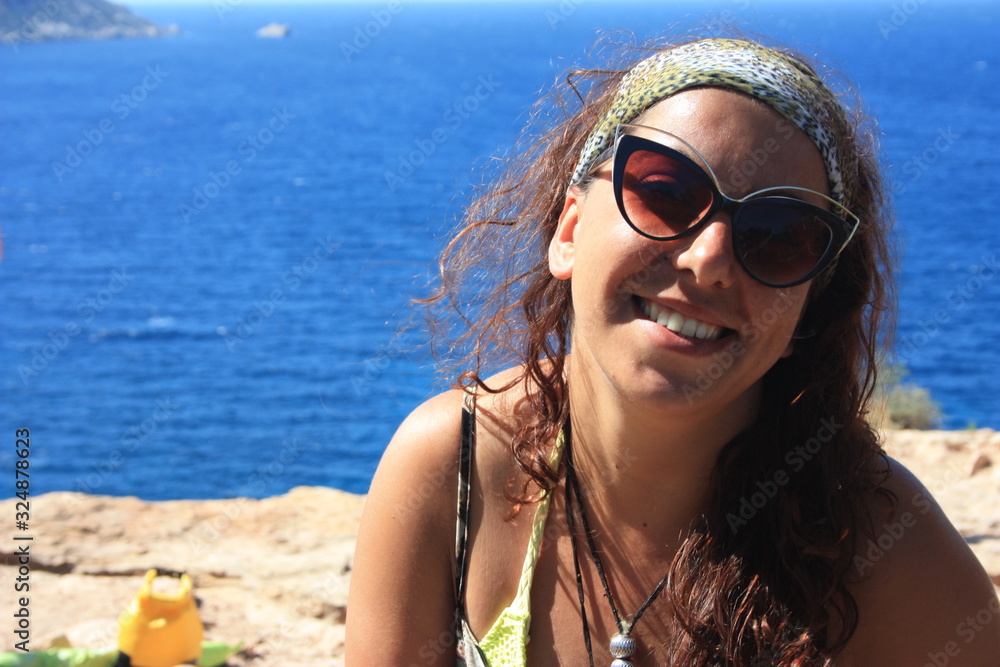 summer vacation of a smiling caucasian brunette girl at the sea in front of the blue water