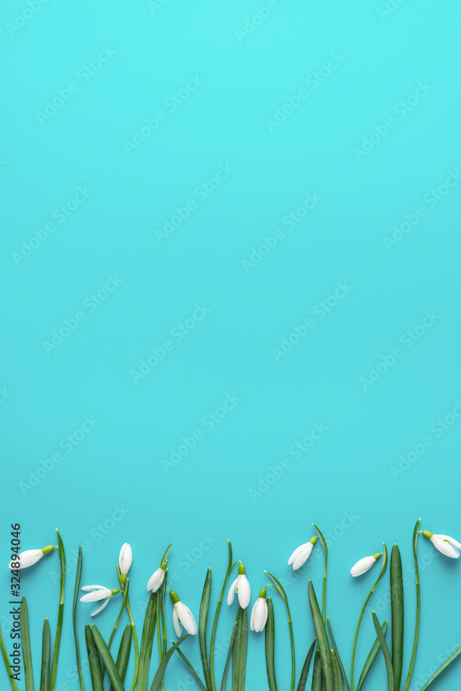 spring snowdrop flowers on blue background. top view with copy space. vertical orientation
