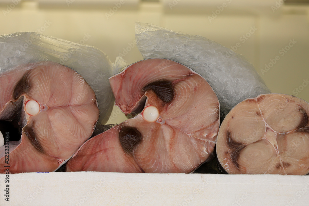 Fresh swordfish at a fish market.