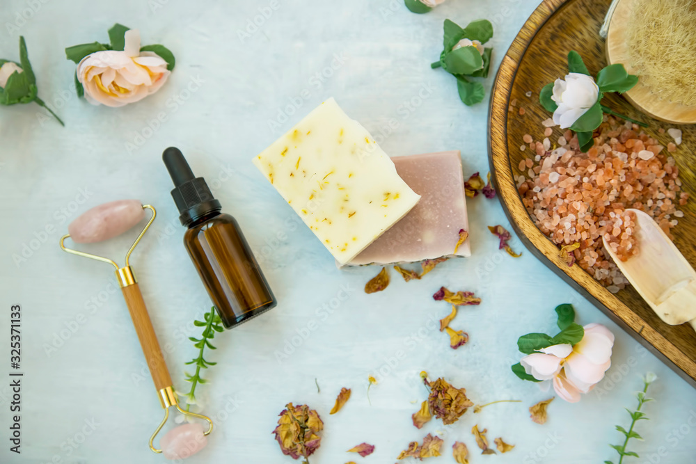 Spa still life setting with natural soap, rose quartz face roller, rose oil bottle and bath salt