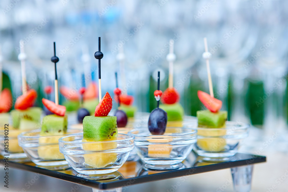 Different canapes of cheese, kiwi, pineapples, strawberries and grapes on a glass tray. Beautiful presentation of the food, catering