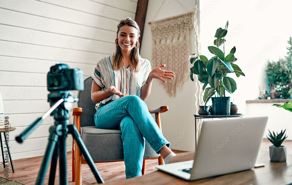 Attractive young woman blogger dressed in jeans and a blouse is recording on the camera while sitting on a comfortable chair at home.
