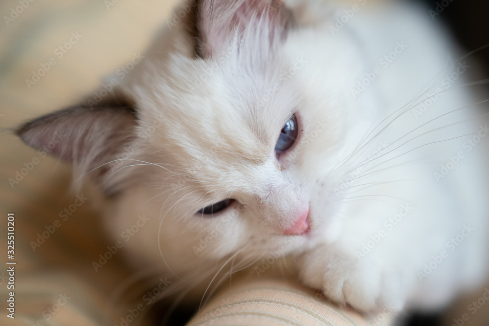 Blue-eyed white Ragdoll kitten with dark ear tips and tail , pink nose, closeup of face, Portrait quality