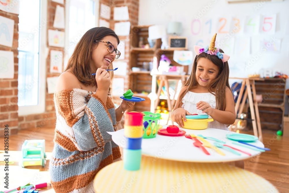 Beautiful teacher and toddler smiling happy playing meals using plastic food and cutlery around lots of toys at kindergarten