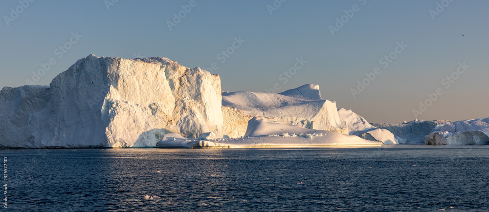 Ice glaciers in Diski Bay during the midnight sun, Ilulissat Icefjord, Greenland