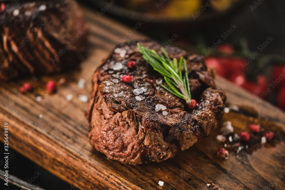 Grilled fillet steaks on wooden cutting board. Succulent thick juicy portions of grilled fillet steak served with tomatoes and roast potatoes on an old wooden board.