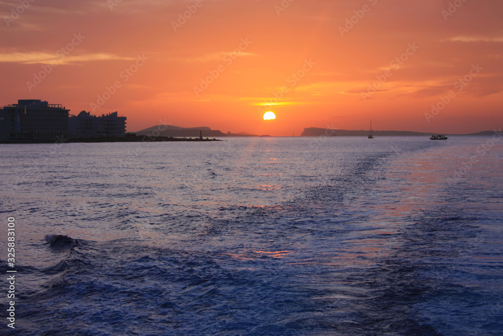 romantic orange sunset over the water of the sea and the chain or anchor of a boat to the side