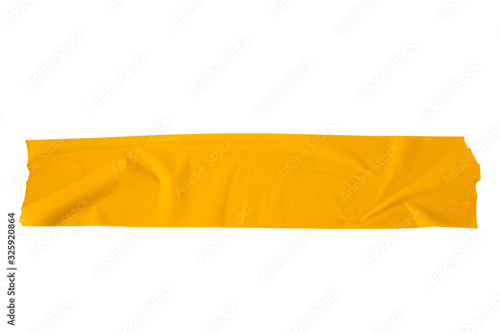 yellow tapes on white background. Torn horizontal and different size yellow sticky tape, adhesive pieces.