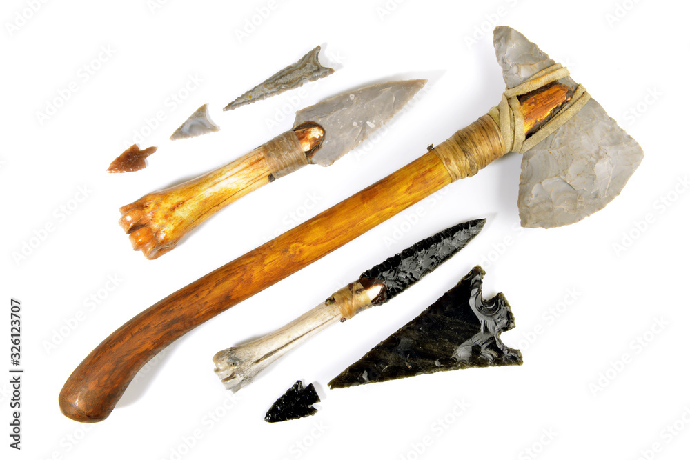 Stone Age Tools on white Background - Stone Age Axe, Knives and Arrows