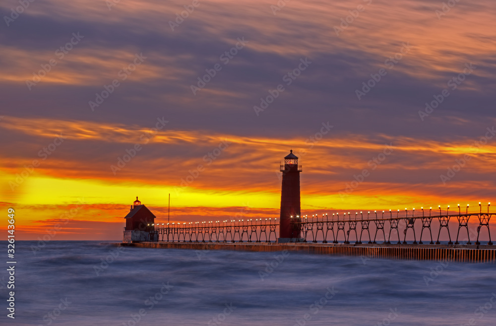 Landscape of the Grand Haven, Michigan Lighthouse, pier, and catwalk at sunset, Lake Michigan, USA