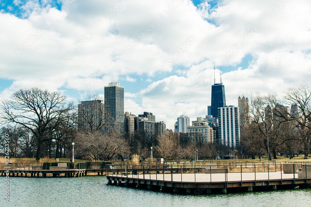 Chicago skyline with skyscrapers, view from Lincoln Park over the lake