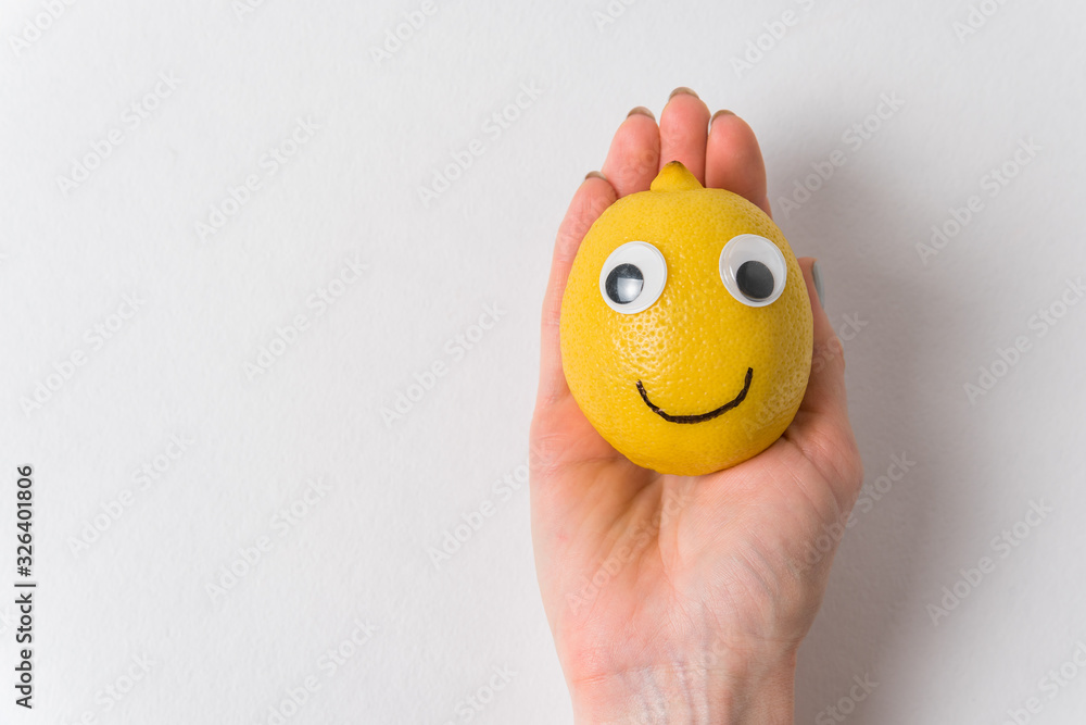 Funny lemon fruit character lies in female hand on white background. Cheerful fruit with eyes and smile