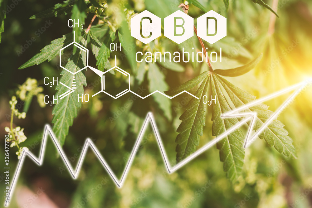 CBD Chemical Formula, Growing Marijuana, cannabinoids and health, medical marijuana, CBD elements in Cannabis. Beautiful background of green cannabis flowers A place for copy space