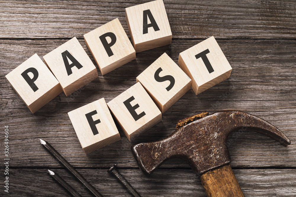 Hammer, nails and wooden cubes with inscriptions on the table. Concept Papa Fest
