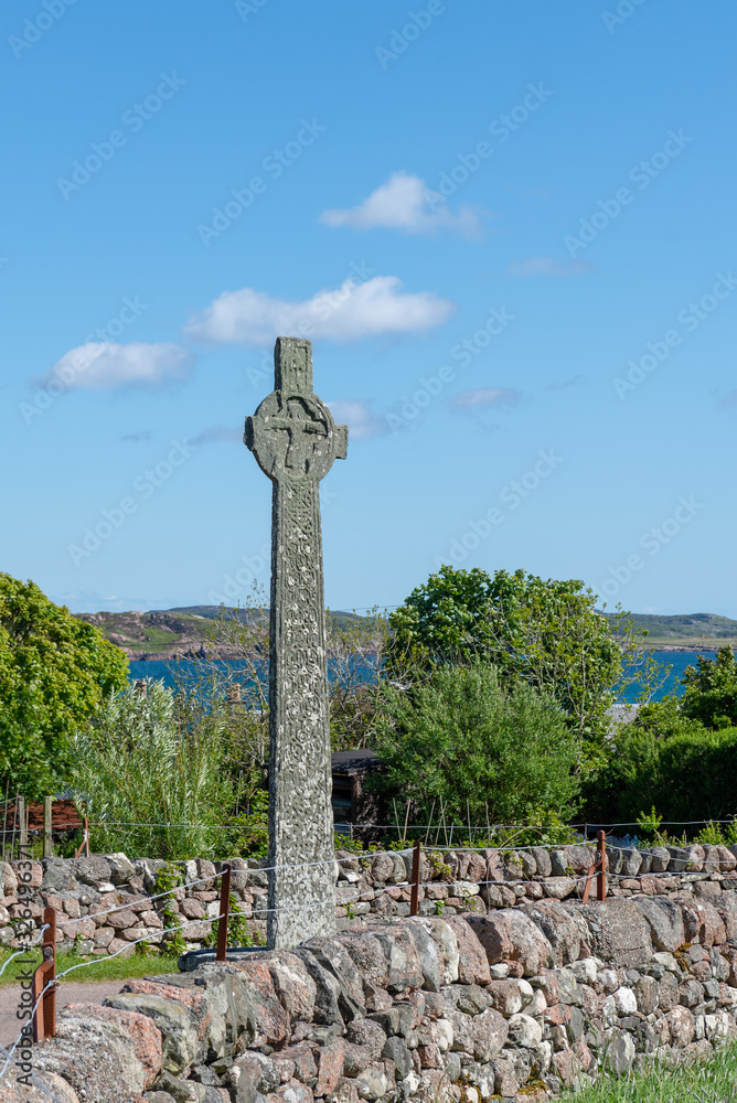 Celtic cross at sunny day in Iona Abbey, Scotland