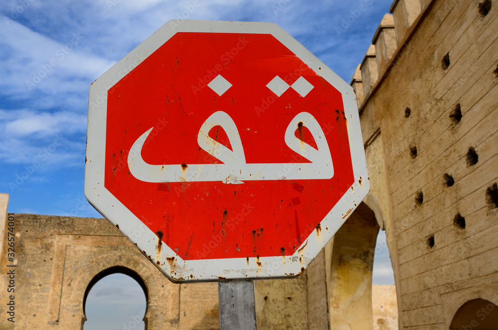 Stop sign in arabic on Avenue des Francais at Place Bou Jeloud in Fes Morocco