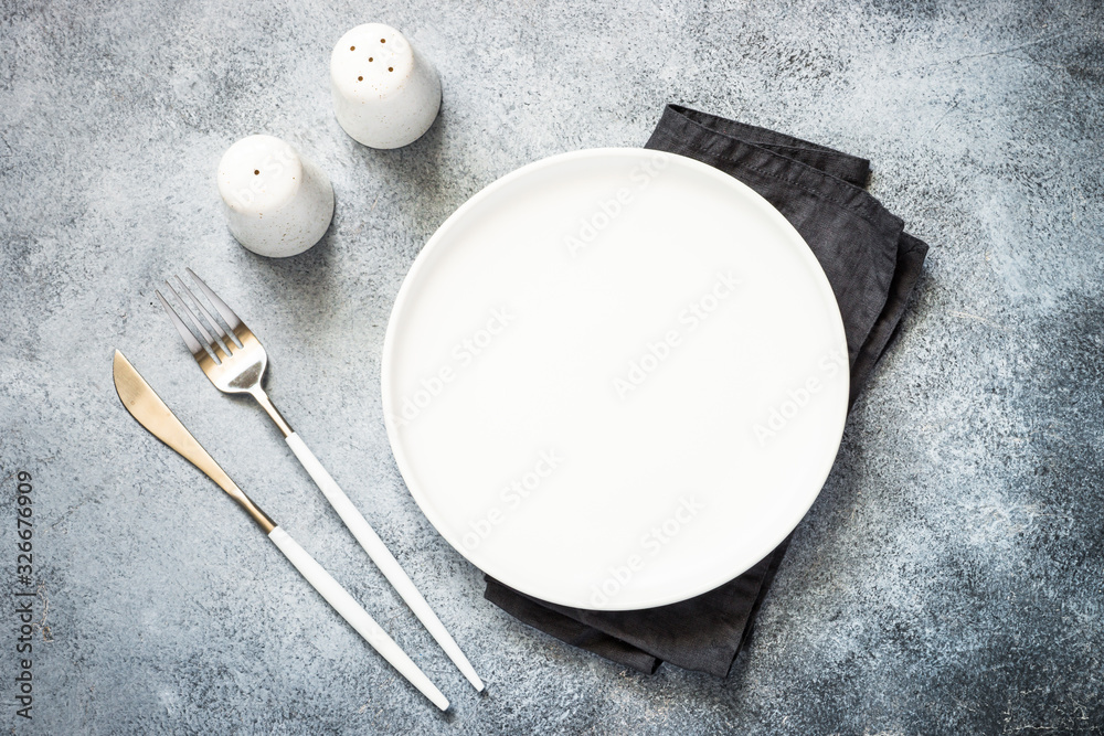 Cutlery set at stone kitchen table top view.