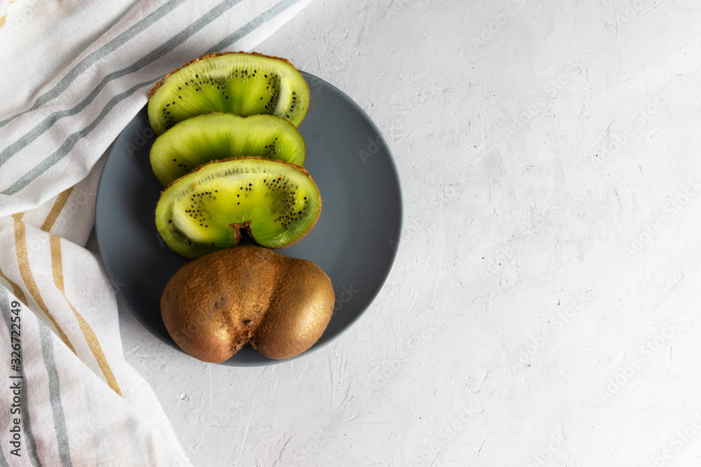 Flat lay, imperfect kiwi fruit on a gray plate with a striped napkin.