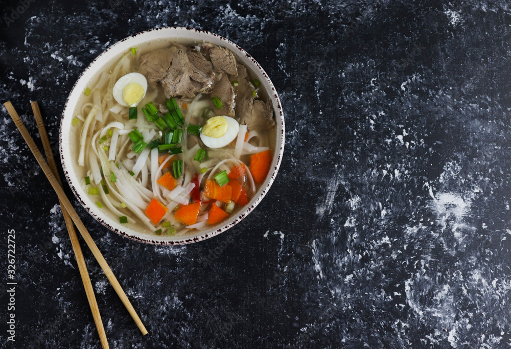 On a black background, flat lay, Vietnamese fo bo soup with quail egg, meat and noodles.