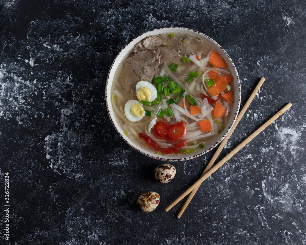 Flat lay, pho broth Vietnamese soup in a beige plate with wooden chopsticks and quail eggs.