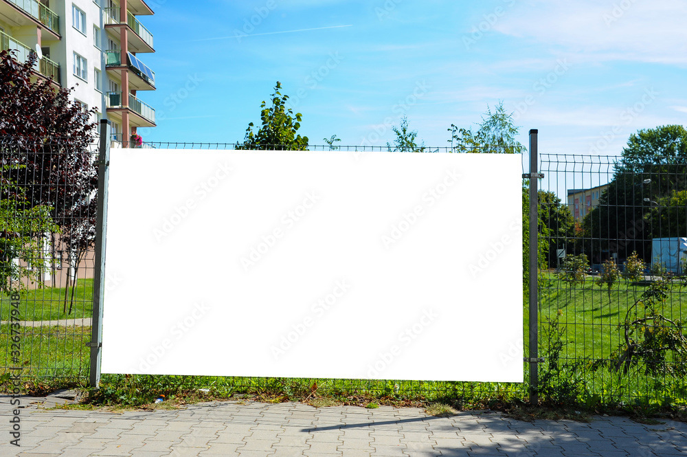 Blank white banner for advertisement on the fence. Residential area on a sunny summer day.