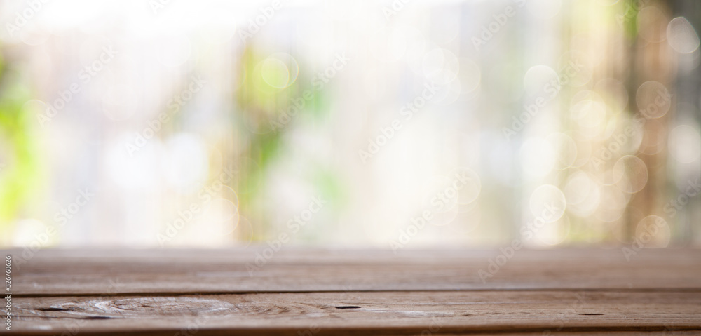 Top of wooden table on window glass blur. Of green from the garden of the vegetable garden on a morning background. To display product montage.