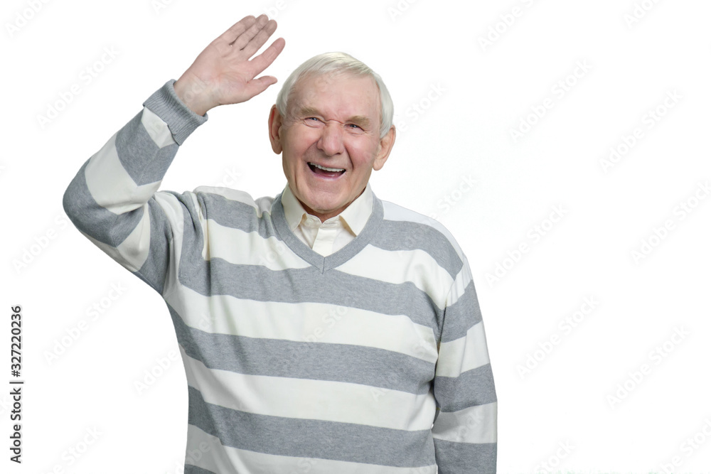 Very happy senior old grandfather is laughing heartily. Cheeful grandpa raising right hand up in white isolated background.