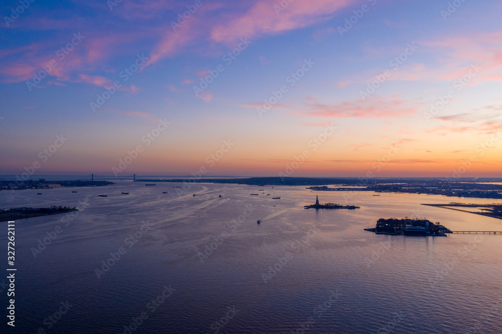 New York City with Ellis Island and Statue of Liberty in sunset, aerial photography