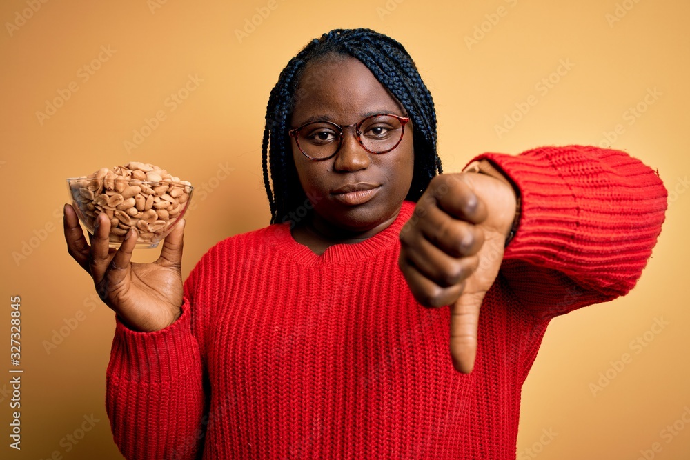 Young african american plus size woman with braids holding bowl with healthy peanuts with angry face, negative sign showing dislike with thumbs down, rejection concept