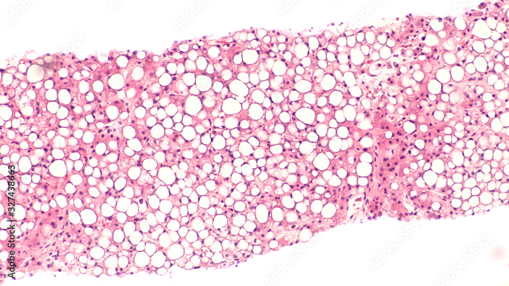 Photomicrograph of liver biopsy histology (pathology) showing steatosis ("fatty liver"), which may be associated with diabetes mellitus, alcohol abuse, or toxins.
