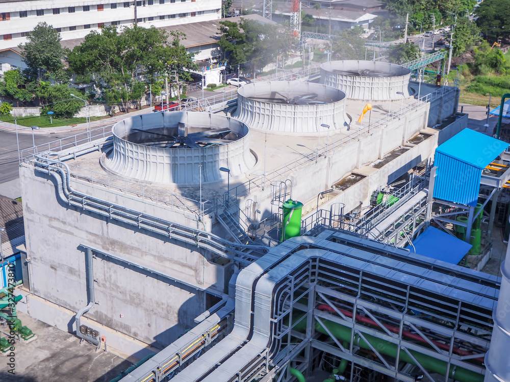 Cooling tower systems for supply cooling water to mature equipment in power plant about industrial concept.