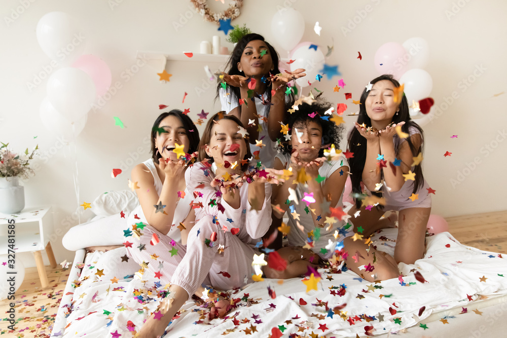 Portrait happy diverse girls blowing confetti at camera at party