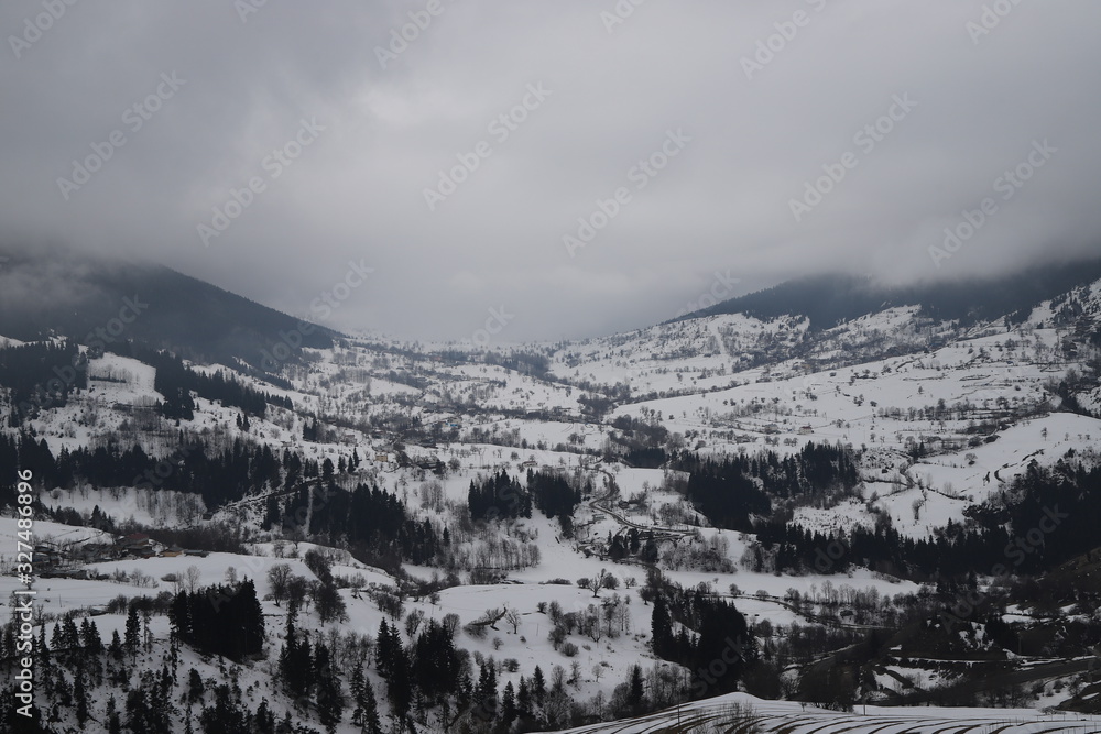 Winter snow village landscape. Mountain valley village on winter snow scene. Savsat/artvin/turkey
