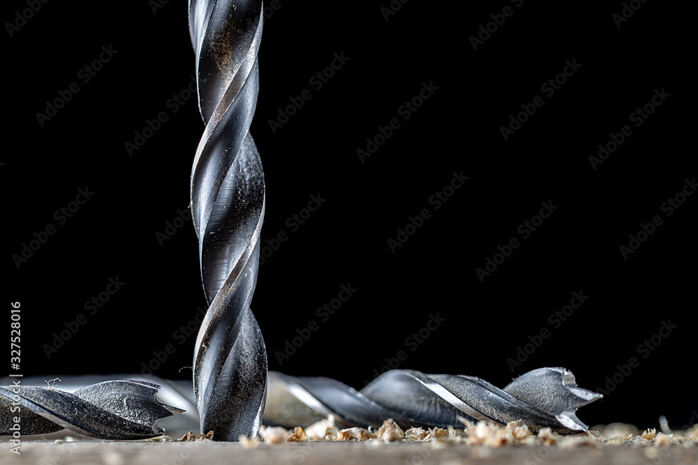 Electric drill bit drills a hole in the board on black background. Joinery and construction work close up. Wood chippings fly off a metal drill. Handyman bores holes into a wooden board.